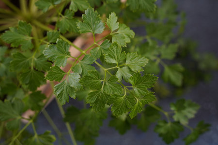 Top view of fresh parsley growing on the ground in the garden. Vegetable background