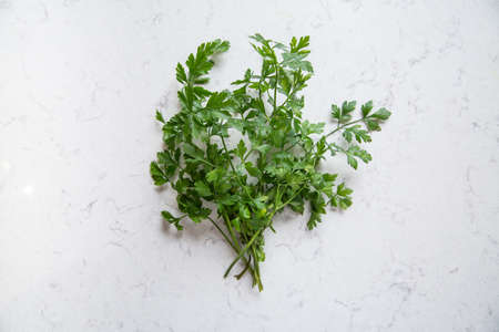 Group of parsley sprigs on a bright marble background, top view. Fresh herbs on a marble kitchen countertop, from above, with a copy-space.