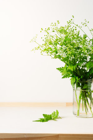 Cow parsley flowers in a glass jar on the table. Bouquet of wild flowers, copy space.