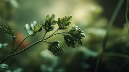 A detailed photograph of a single Parsley, swaying gently in the wind, captured in natural daylight. Fresh and airy atmosphere, soft motion blur on leaves, crisp details on textures, background softly blurred into natural greenery, cinematic natural light, realistic photography style.