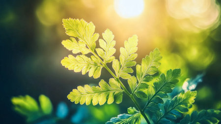 A close-up view of vibrant green fern leaves basking in warm sunlight, creating a serene and peaceful atmosphere in a natural outdoor setting.