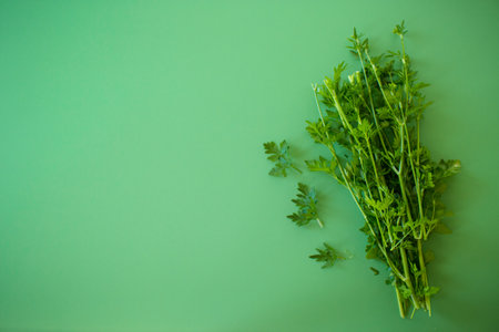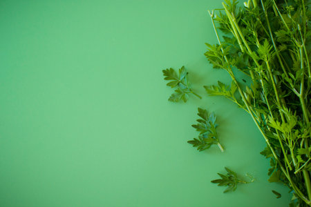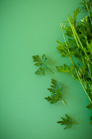 Bunch of fresh aromatic parsley on green background from above.