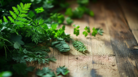 green parsley growing on a wooden panel with a white background. the composition is styled with stripes, creating a soft and dreamy atmosphere. the innovative page design showcases the vibrant absinthe culture. the light beige and white colors add to the aerial view of the lively tableaus. ai generated