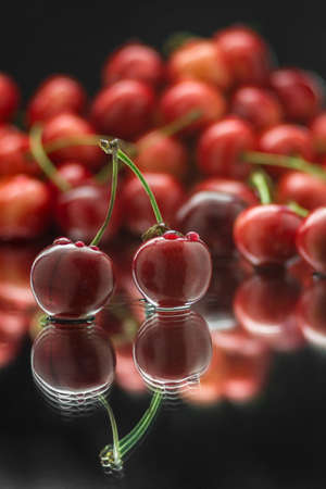 Juicy cherry close up photo. Water drops on fresh berries. Dark grey textured background. Healthy eating concept.