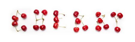 Cherries with petioles lined in rows on a white background. Pattern of cherries. Fruit Pattern