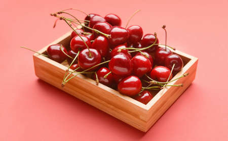 ripe cherries lies in a box in beautiful flat rows. Plenty of delicious juicy berries. High quality photo