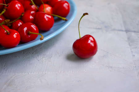 Fresh cherry on plate on wooden blue background. fresh ripe cherries. sweet cherries. Close up