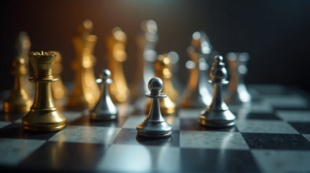 A close-up view of a chessboard with golden pieces. The pieces are arranged in a strategic formation. The board is lit from the side, creating soft shadows that enhance the dramatic atmosphere.