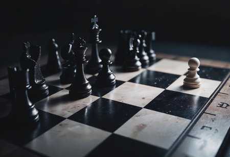 A solitary white pawn stands on the edge of a dark chessboard, surrounded by menacing black pieces. The setting is moody and dramatic, igniting a sense of strategic anticipation.