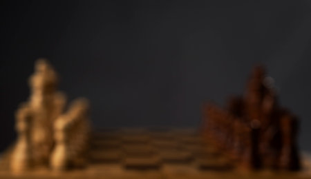 Blurred chessboard with chess pieces at beginning or start on gray background with copy space.