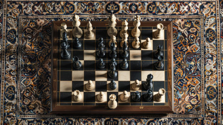 Chess board on a rug, with pieces scattered all over the board. generative ai