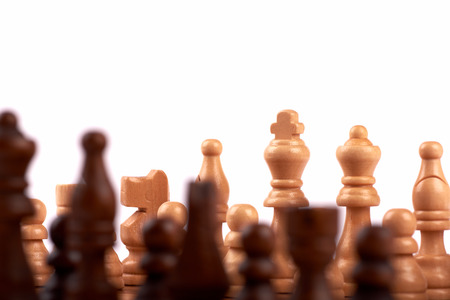 Wooden chess pieces in a duel on a chessboard. King, lady and shooter with horse. Out of focus team of enemies. Isolated on white background