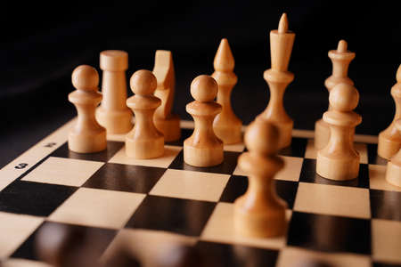 A chess board and black and white chess pieces on a wooden table, close-up, selective focus