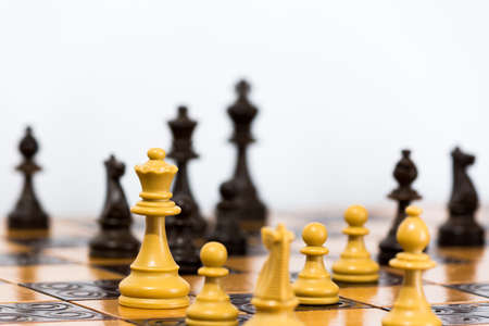 White's pieces on the chessboard, top view. Wooden chess pieces on the chessboard. Intellectual game -chess. Chess pieces on the Board. A game of chess.