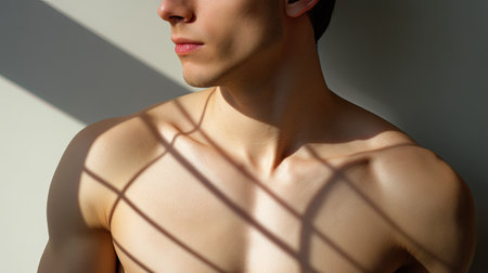 A striking portrait of a young man showcasing a well-defined physique under natural light, creating captivating shadows that enhance his features and evoke beauty.