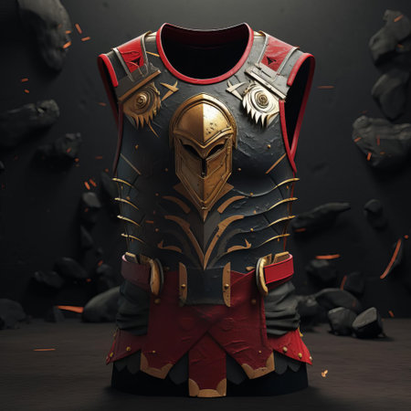 this spartan-inspired waistcoat design, perfect for a t-shirt, showcases a bold and fearless warrior spirit, featuring iconic greek helmets, shields, and laurel wreaths, evoking ancient greek culture and mythology, ideal for history buffs and fans of 300. ai generated