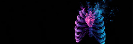 Vibrant colors showcase a heart surrounded by ribcage details with a black background, illustrating the beauty of human anatomy through artistic design.