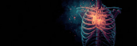 Detailed digital illustration of a human rib cage highlighted in luminous colors on a dark background, ideal for educational materials in medical and anatomical fields.