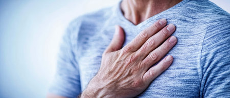 Severe heartache, man suffering from chest pain, having heart attack or painful cramps, pressing on chest with painful expression.
