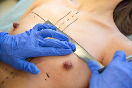 Plastic Surgery. Closeup Of Naked Woman Body With Black Surgical Marks On Her Breast. Closeup Of Doctor Hands Drawing Lines On Female Breast Before Breast Augmentation Operation.