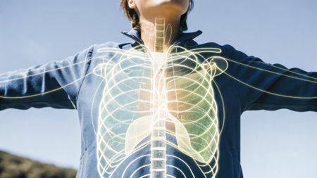 Close-up view of a woman wearing a tank top with illuminated lungs and trachea. The anatomical representation glows against a warm, natural background in outdoor setting.