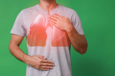 Man holding hands near chest with illustration of lungs on green background, closeup