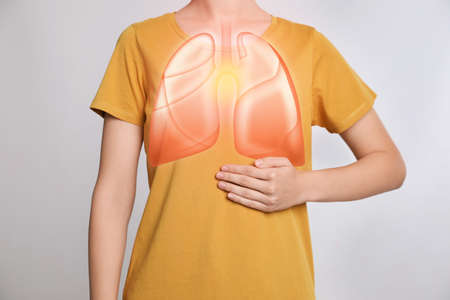Woman holding hand near chest with illustration of lungs against gray background, closeup