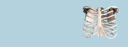Banner with chest ribs on blue background. Skeletal system anatomy, body structure, medical education. Copy space. High quality photo