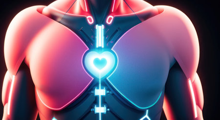 The upper body of a biohacker is enveloped in vibrant AR overlays that visualize the human bodys internal systems with pulsating energy patterns around their chest..
