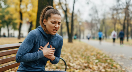 Young caucasian woman experiencing chest pain in autumn park setting for health awareness