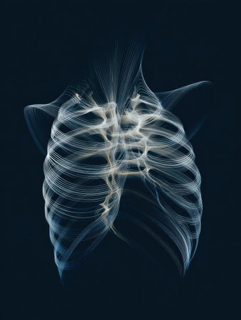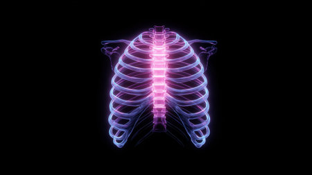 Detailed digital illustration of a human rib cage highlighted in luminous colors on a dark background, ideal for educational materials in medical and anatomical fields.