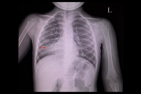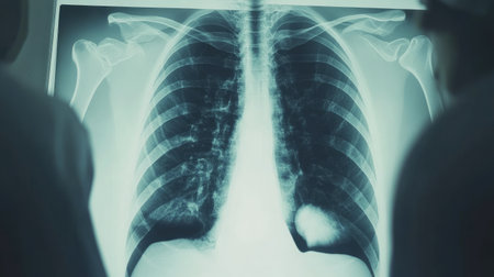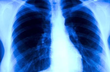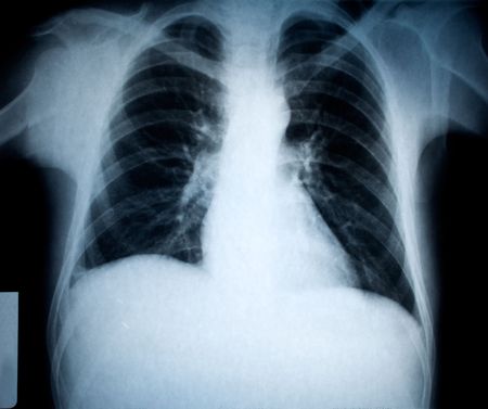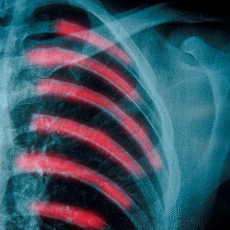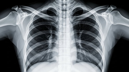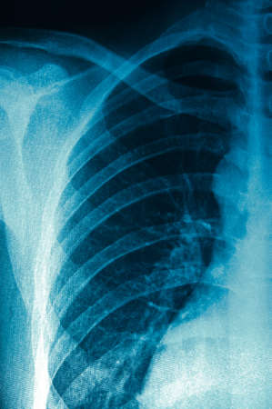 Detailed X-ray image showing human ribcage and shoulder bones in black and white