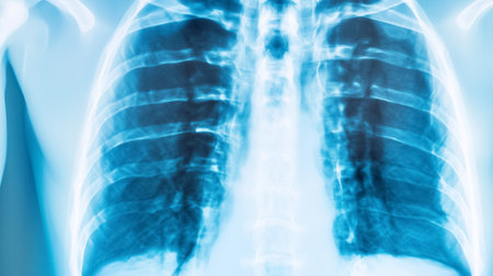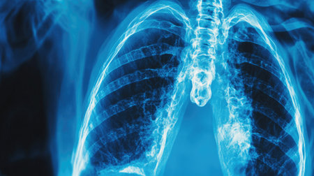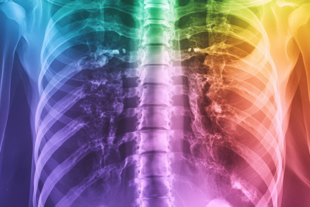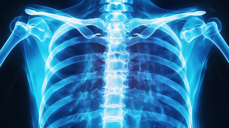 High-resolution X-ray image depicting the chest area, highlighting the rib cage and spinal structure, useful for educational and medical purposes.
