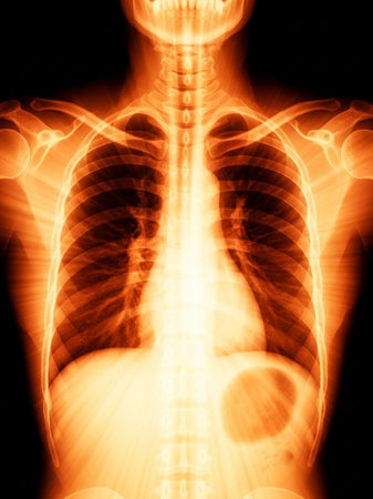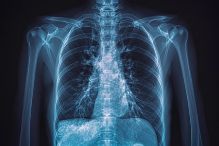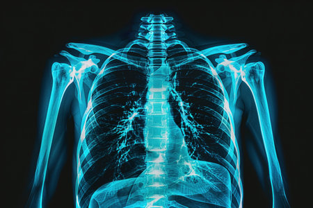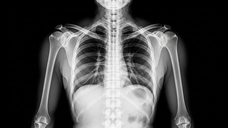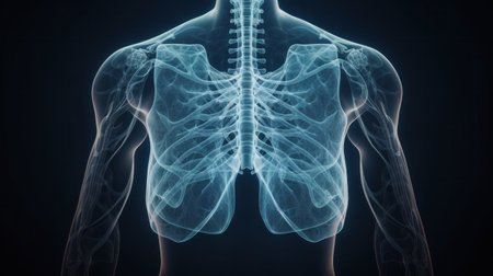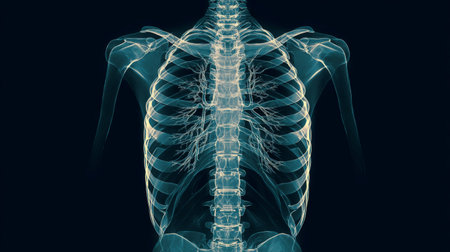 X-ray image of a human chest and spine, displaying detailed bone structure. Concept of medical imaging, radiology, human anatomy, diagnostic tool.