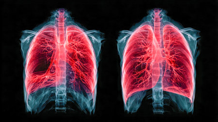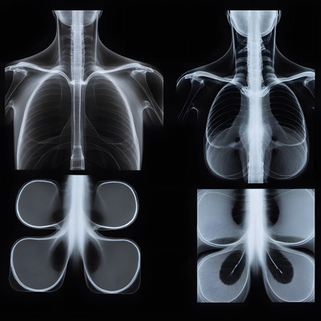 X-ray views reveal the complex anatomy of the thorax, highlighting lung structures and the skeletal framework.