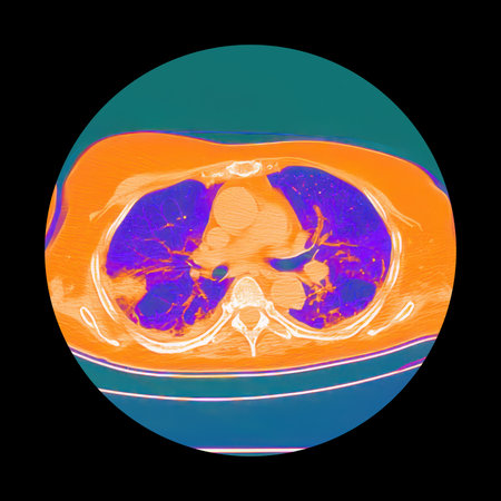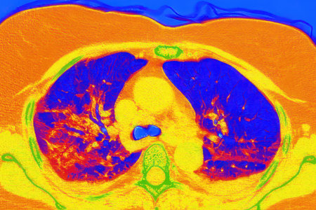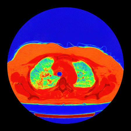Human lungs with COVID-19 pneumonia, color-enhanced CT scan showing normal lung tissue in blue-green and affected bilateral areas with ground-glass opacities and crazy-paving patterns in orange-red.