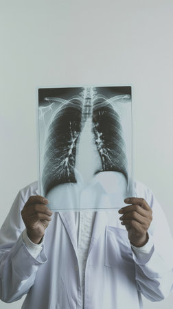 Healthcare worker analyzing X-ray of lungs, medical charts and screens in background