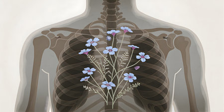 An x-ray-like image of a ribcage with a bouquet of light blue flowers superimposed. The background is a mostly transparent off-white. The flowers are delicate and appear to be growing from within the chest cavity. The overall mood is serene and slightly melancholic.