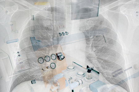 Double exposure of x-ray image of lung with pneumonia and ICU medical ventilator