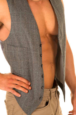Classic fashion look. Six packs closeup. Sexy male torso in suit.