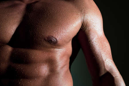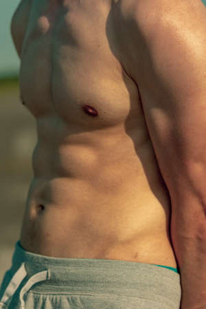 Mans torso. Sexy guy with muscle body. Chest, breast of muscular man. Bare torso of a muscular male model. Closeup mens nipple.