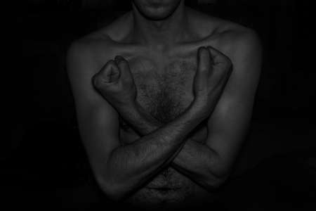 Male hands close-up Black and white image of a muscular man, athletic body, beautiful masculine forms of muscles, relief. Beautiful strong and flexible body, sexy attractive.
