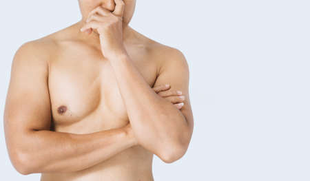Many moles on the chest of a young man. Check benign moles. The effect of the sun on the skin. The concept of health. Hairy chest, athletic build. Close up.
