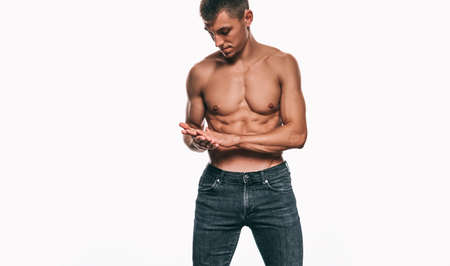 Young macho male model in jeans showing his sexy body isolated on a white background. Shirtless bodybuilder man with sexy abdomen posing over white wall. Health, sport and people concept