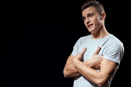 handsome man in white t-shirt on black background inflated arm muscles sport model cropped view Copy Space