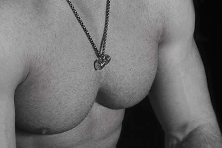 Naked torso of a male athlete in close up. The body of a shirtless bodybuilder with a pendant in the form of a silver dumbbell. Jewelry barbell. The muscular chest of a man in love with sports.