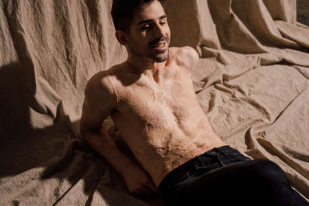 Sexy body, nude man, naked male, muscled. Strong mans, bodybuilder, muscular men. Copy space. Beautiful male torso