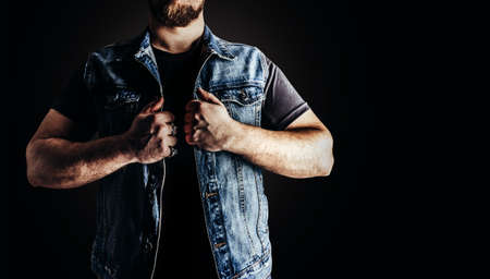 Photo of man in jeans shirt and denim biker vest standing on black background.