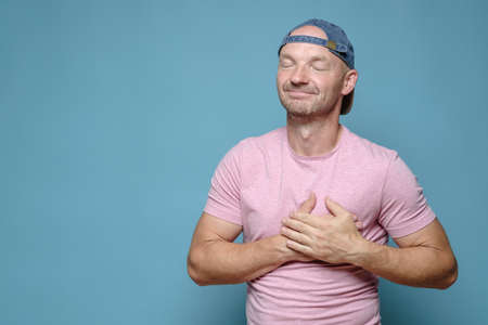 Loving Caucasian man holds his hands behind his heart and dreamily closed his eyes. Copy space.