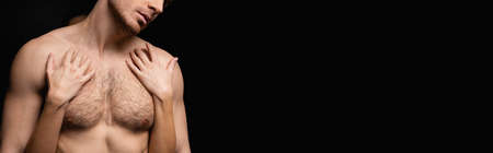cropped view of woman hugging shirtless and muscular man isolated on black, banner